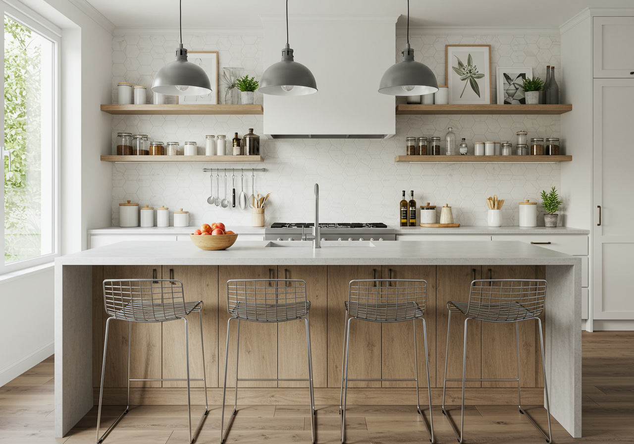 Now that you have your overall goals established for your custom kitchen, it’s time to decide what architectural feel and style you’re trying to achieve. Luckily, companies like Houzz have a handy guide that will help you make this decision easy. Selecting a cabinet style is a great place to start. If you tend to prefer traditional or Old World-style kitchens, go with a raised-panel front on your cabinets. If a sleek, modern kitchen is your ideal style, then choose a flat-panel cabinet. If you are somewhere in the middle of these two styles and prefer a timeless look, go with a shaker cabinet. Beyond cabinet style, another way to add your own flavor to your kitchen design is by adding color to some or all of the cabinets. If you can’t commit to a single color or a single wood look, consider mixing and matching. Another way to add some flair includes open shelving or glass-front cabinets for displaying your favorite trinkets, gorgeous succulents, or prized dishware. Lastly, consider some unique accents to your cabinet style by knowing your options for molding and hardware. As an overarching goal, it will serve you well to balance function with beauty when selecting your kitchen cabinets. With so many ways to add your own special touch to the cabinet style of your kitchen, you can set the tone for your overall kitchen design.